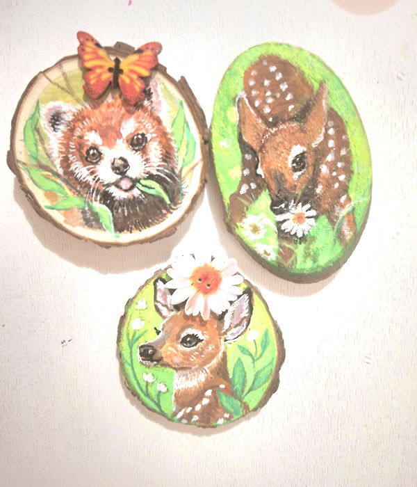 תליונים ומגנטים מיוחדים, מעוצבים מדאס מצוירים בעדינות באקריליק ומצופים לכה מבריקה / ציור על פרוסות עץ או